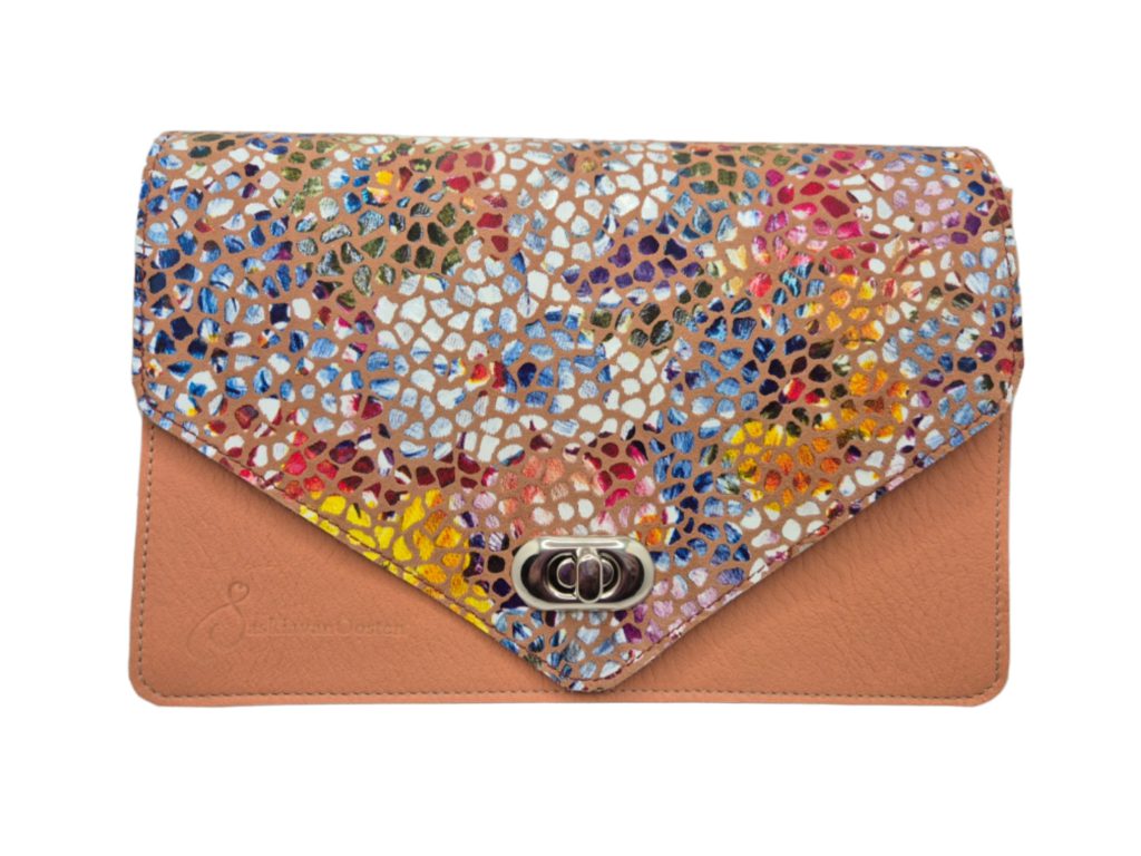Laat je niet afschrikken door felle kleuren, met een klep erover zie je van voren nog enkel twee driehoekjes van je basistas.