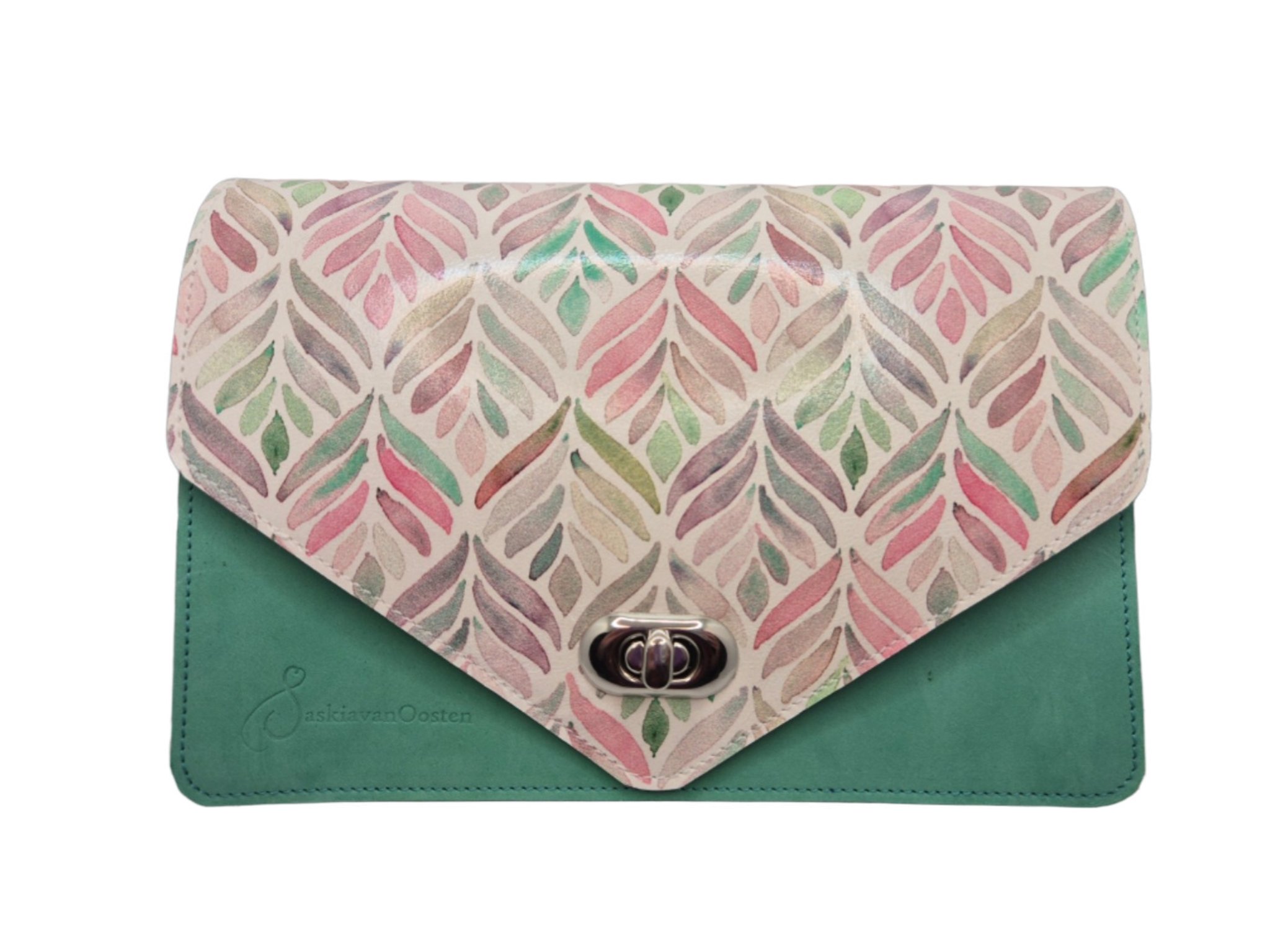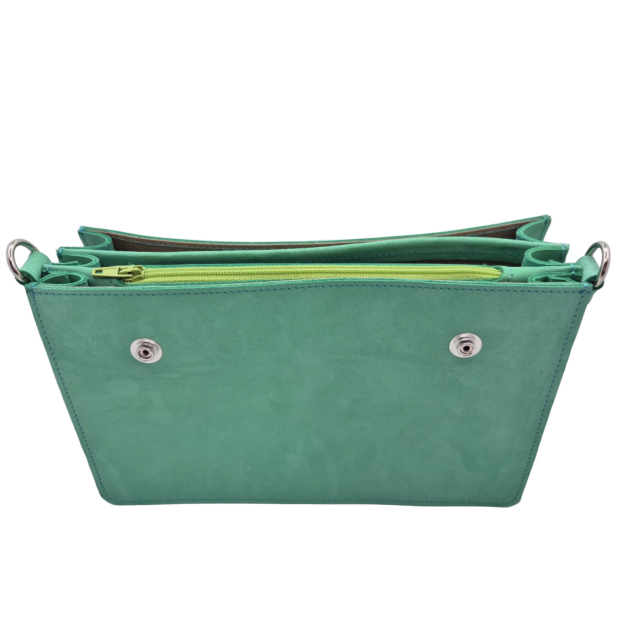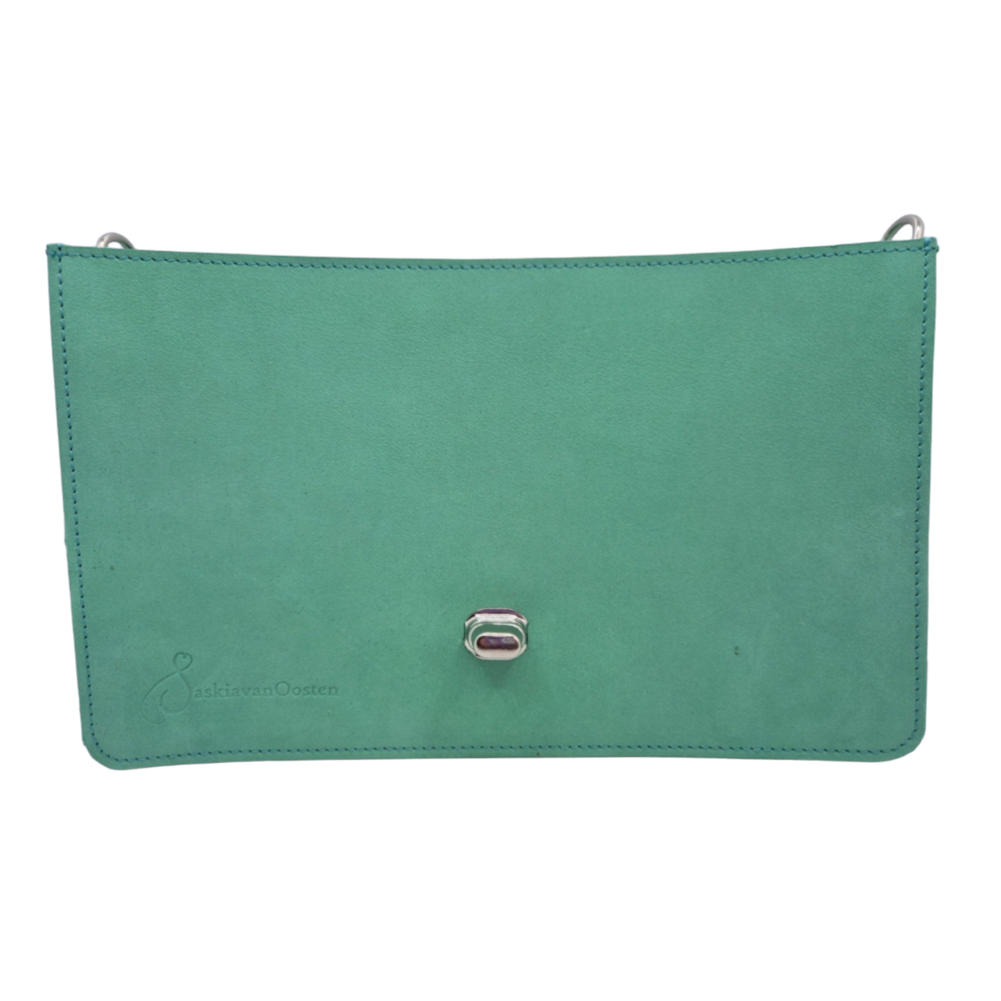 Swapflaps body in geschuurd mintgroen leer. Let op, deze leersoort is gevoeliger voor verkleuren en beschadigingen.