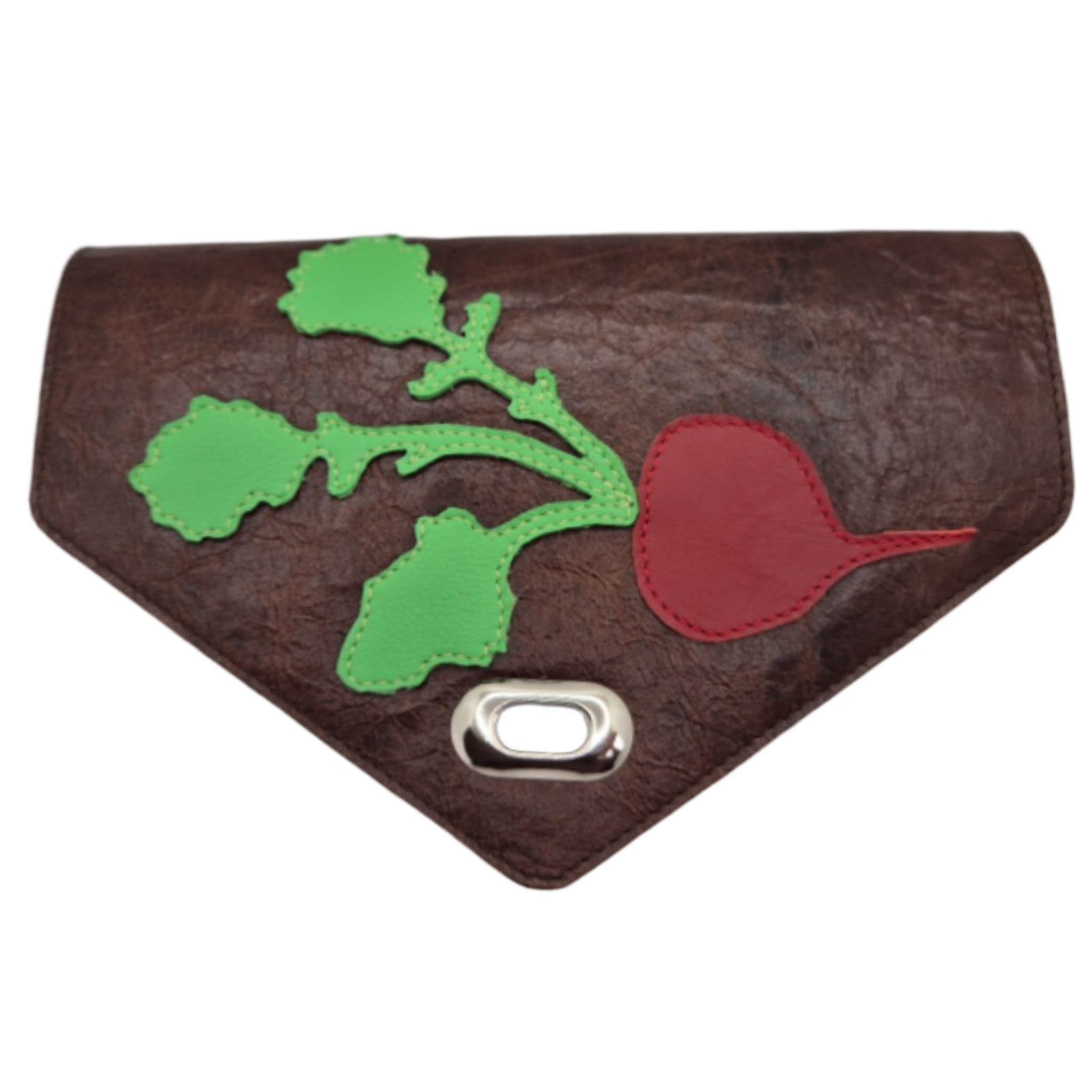 Klep passend op de swapflaps tassen in bruin crinckle leer met applicatie van een biet (of grote radijs, wat je wilt ;))