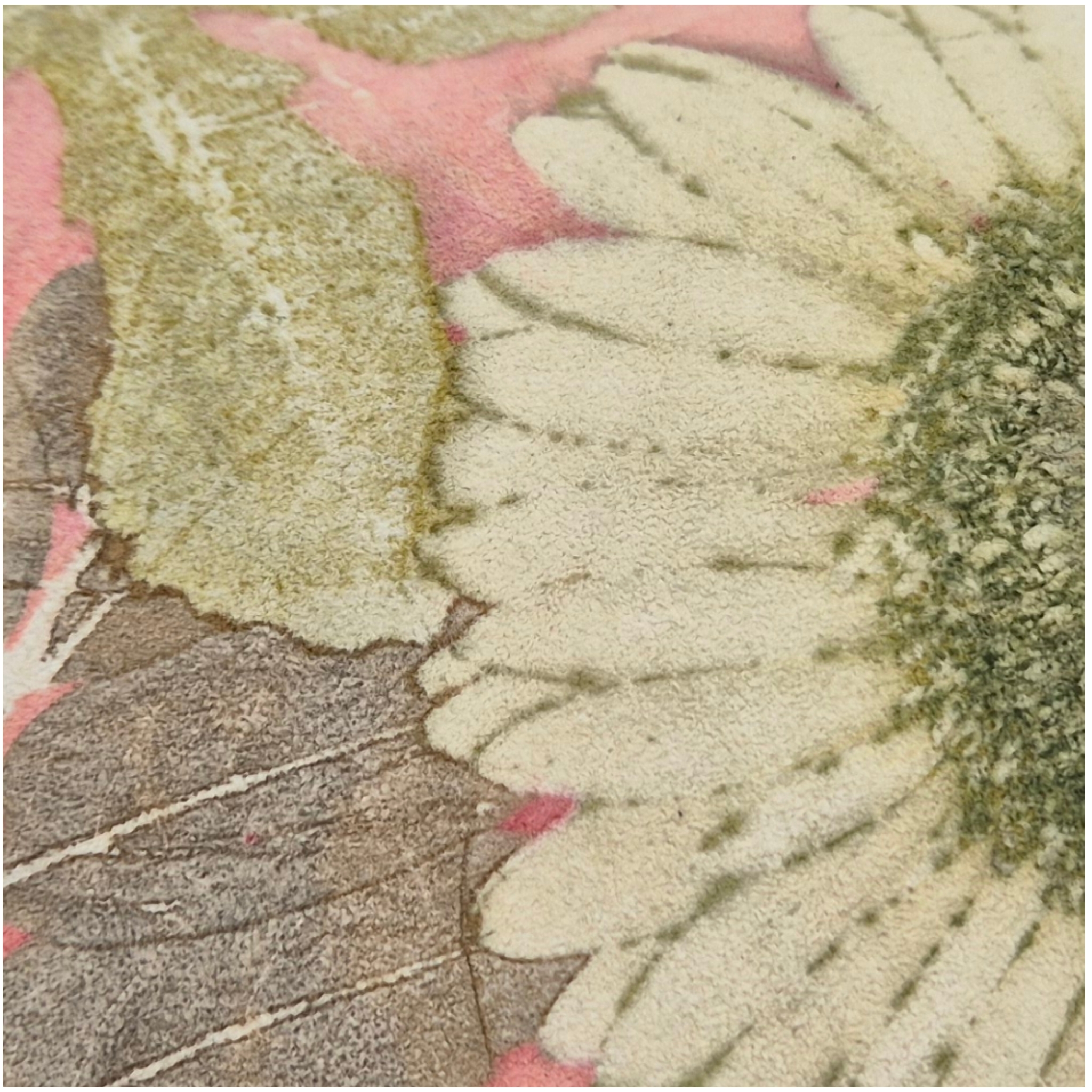 Door planten en bloemen op het leer te leggen en te stomen zijn met behulp van ecoprint-technieken de pigmenten uit de plant op leer te drukken. De achtergrond wordt geverfd met zijdeverf. Iedere ecoprint-klep is hierdoor uniek! Op deze klep zie je o.a. vijg, gerbera en hortensia afgedrukt.