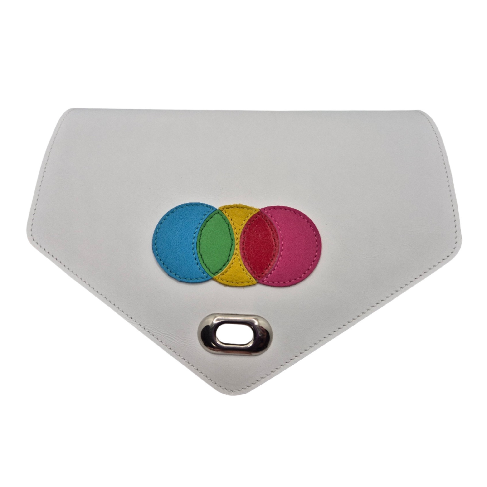 Klep passend op alle Swapflaps tassen in glad wit leer, met applicatie “connected” ontworpen door Stephanie Harrisson van The New Happy.