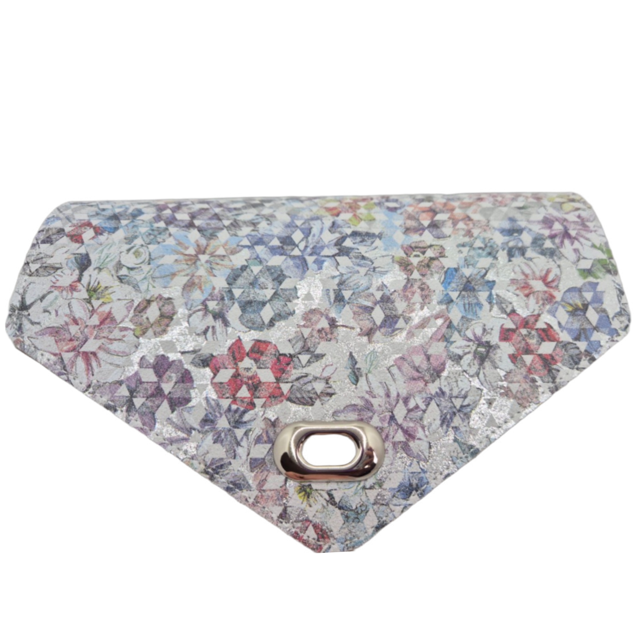 Klep passend op de swapflaps tassen in wit leer met geometrische bloemenprint. Hierin zitten zilveren details.