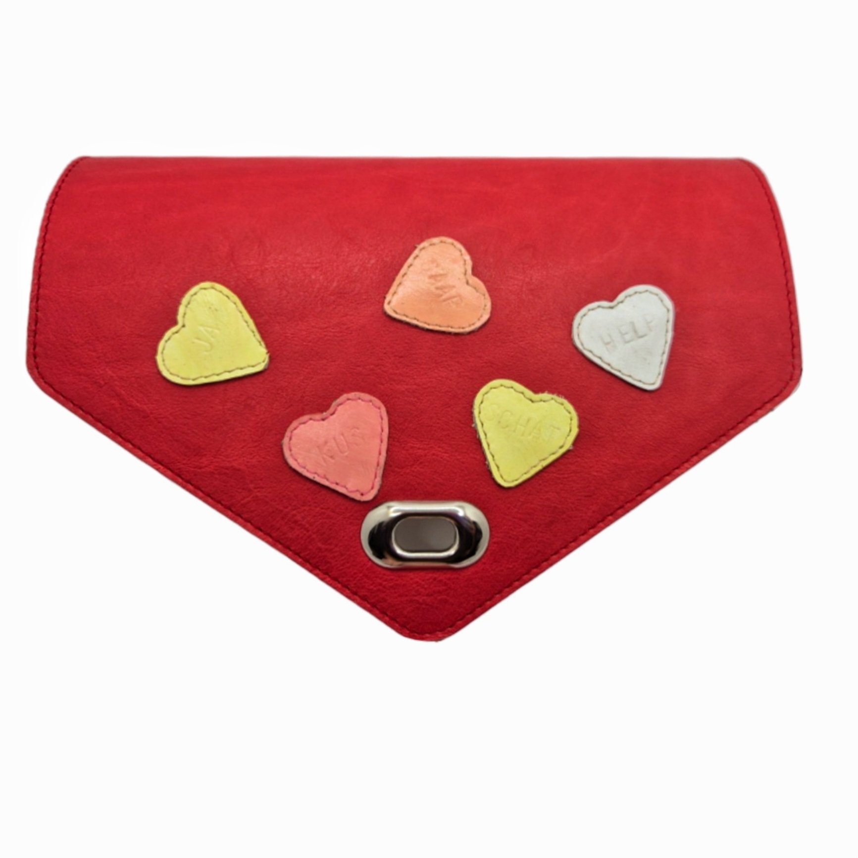 klep passend op alle Swapflaps-tassen in rood leer met opgenaaide leren “snoephartjes” in wit, lichtgeel, lichtoranje en roze.