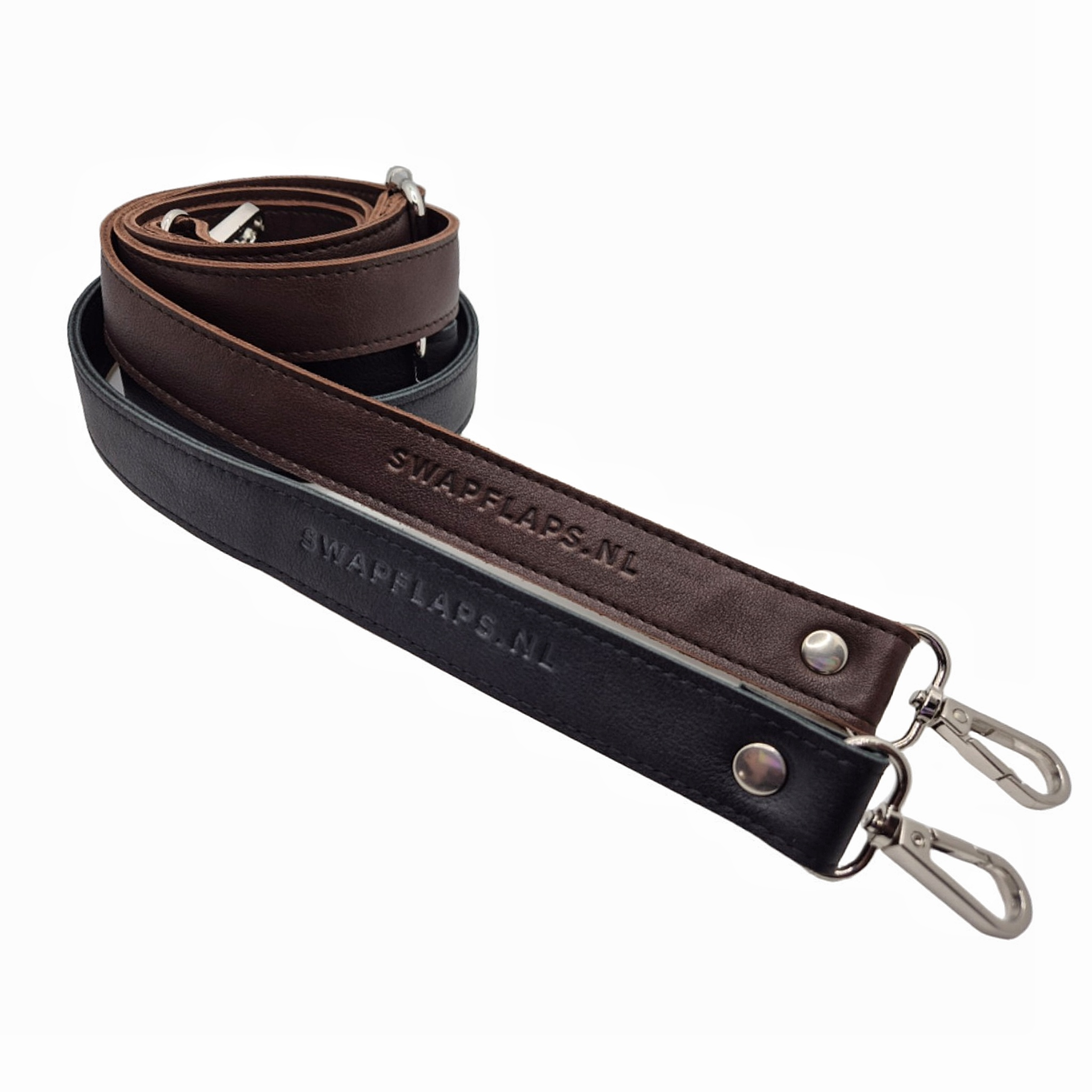 Zwarte leren schouderband voor de Swapflaps-tas. 25mm breed, dubbellaags gestikt leer, verstevigd tegen uitrekken. Voorzien van logo, zilverkleurige schuiver om de lengte bij te stellen en 2 zilverkleurige musketonhaken. op de tweede foto samen met de chocoladebruine variant. U koopt hier alleen de zwarte band.